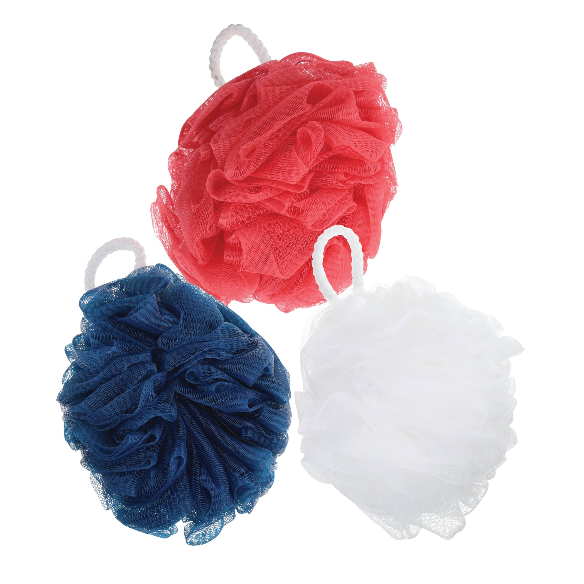 - 3 Color Shower Puffs: Our loofah puffs come in 3 separate colors, Red, White and Blue.