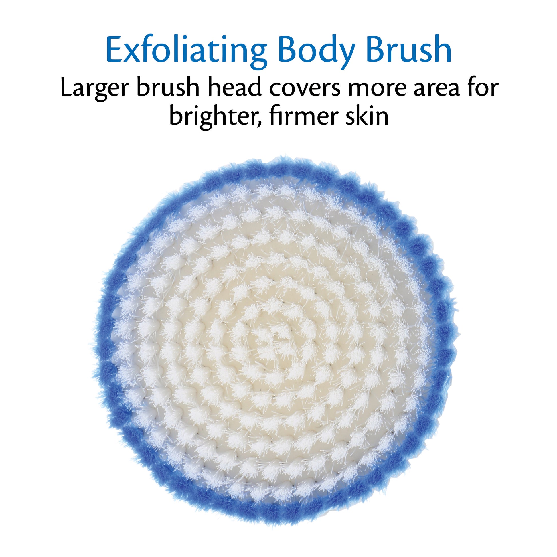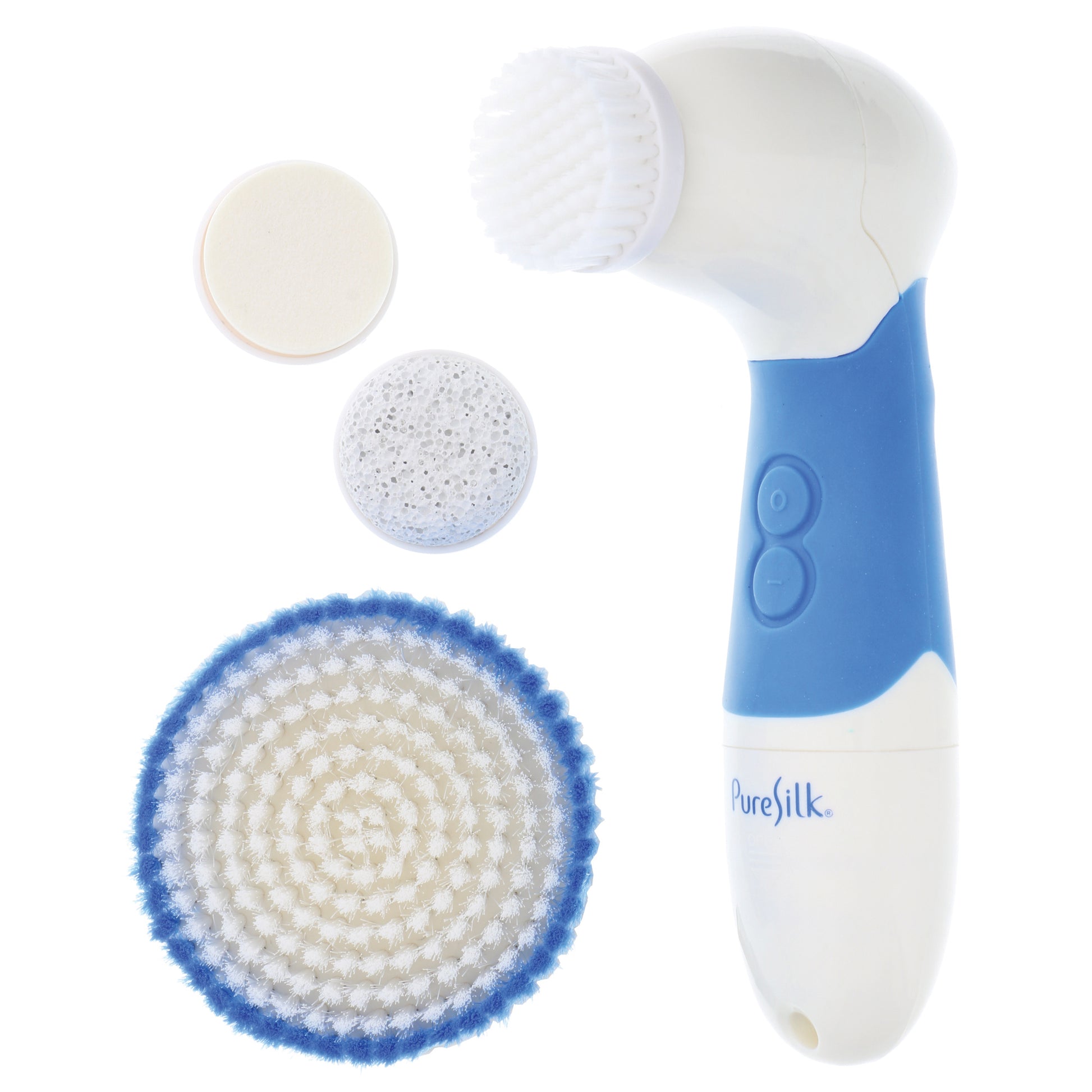 Foam Sponge, Pumice Stone, Exfoliating Face Brush, Exfoliating Body Brush The Pure Silk Rotating Cleansing Brush is the perfect exfoliating tool. It comes with 4 attachments that easily snap on to the handle. The exfoliating face brush deep cleans and exfoliates while the foam sponge gently exfoliates skin. The pumice stone attachment can be used to remove tough skin on feet. The exfoliating body brush attachment can be used with your favorite body wash or cleanser to gently micro massage skin while exfoliating and deep cleaning to leave skin feeling energized and radiant.