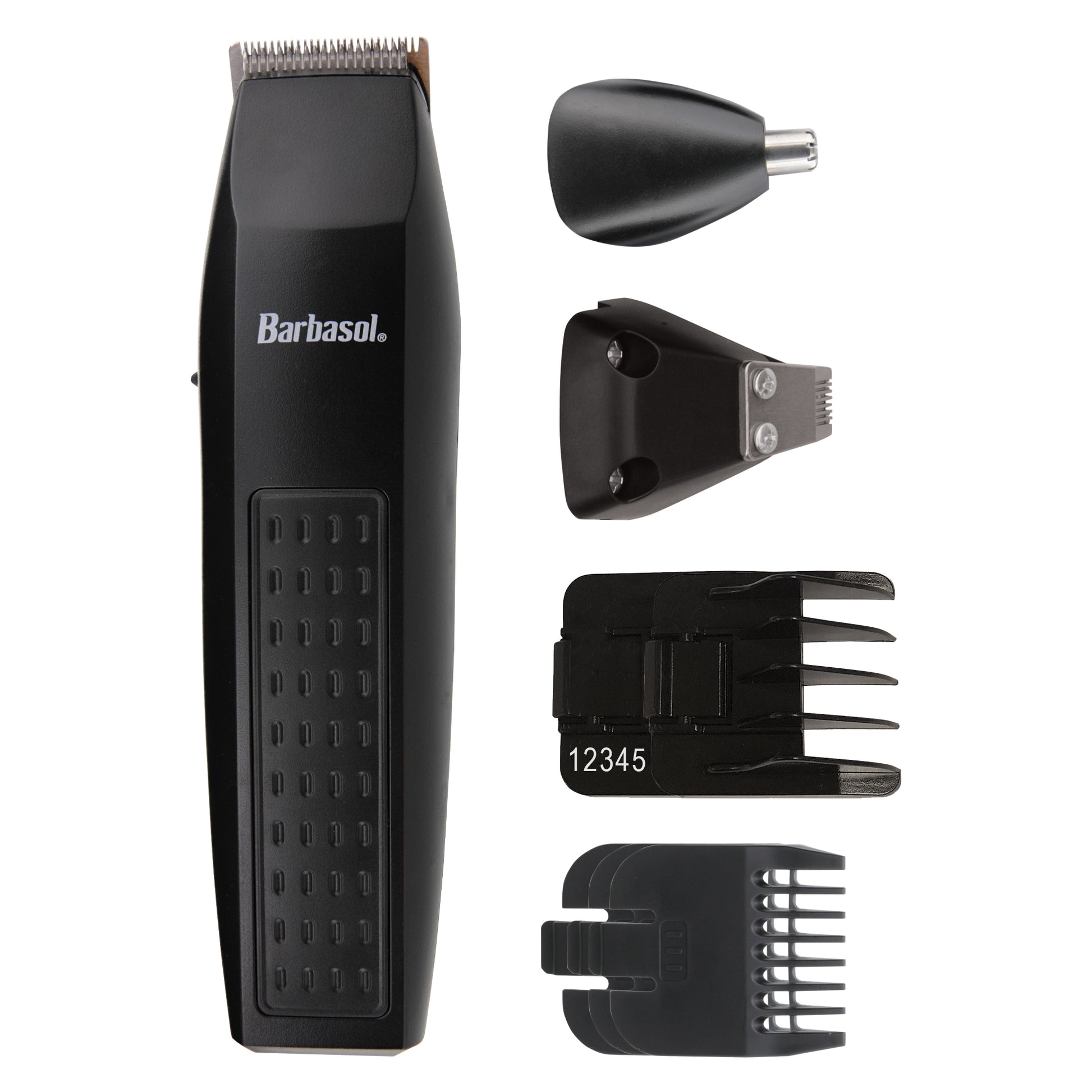 The Barbasol Battery-Powered 7-Piece All-in-1 Grooming Set comes with 3 interchangeable, stainless steel shaving attachments for your device. The beard trimmer refines and styles tricky areas like under the nose, sideburns and beards. Coupled with the ear and nose trimmer and grooming comb, you'll have everything you need to keep your hair neat and clean. Included in this kit is a convenient stand to keep all of the attachments and tools neatly organized in your grooming area. • Kit includes beard trimmer, ear and nose trimmer attachment, detail trimmer attachment, 5-position comb guide, and 3 comb guides. • Keeps all tools for grooming in 1 place. • Beard trimmer refines and styles tricky areas. • Foil shaver attachment for cutting unwanted ear hair. • Requires 2 AA batteries (sold separately). • Includes stand. • Sold as 1 Each.